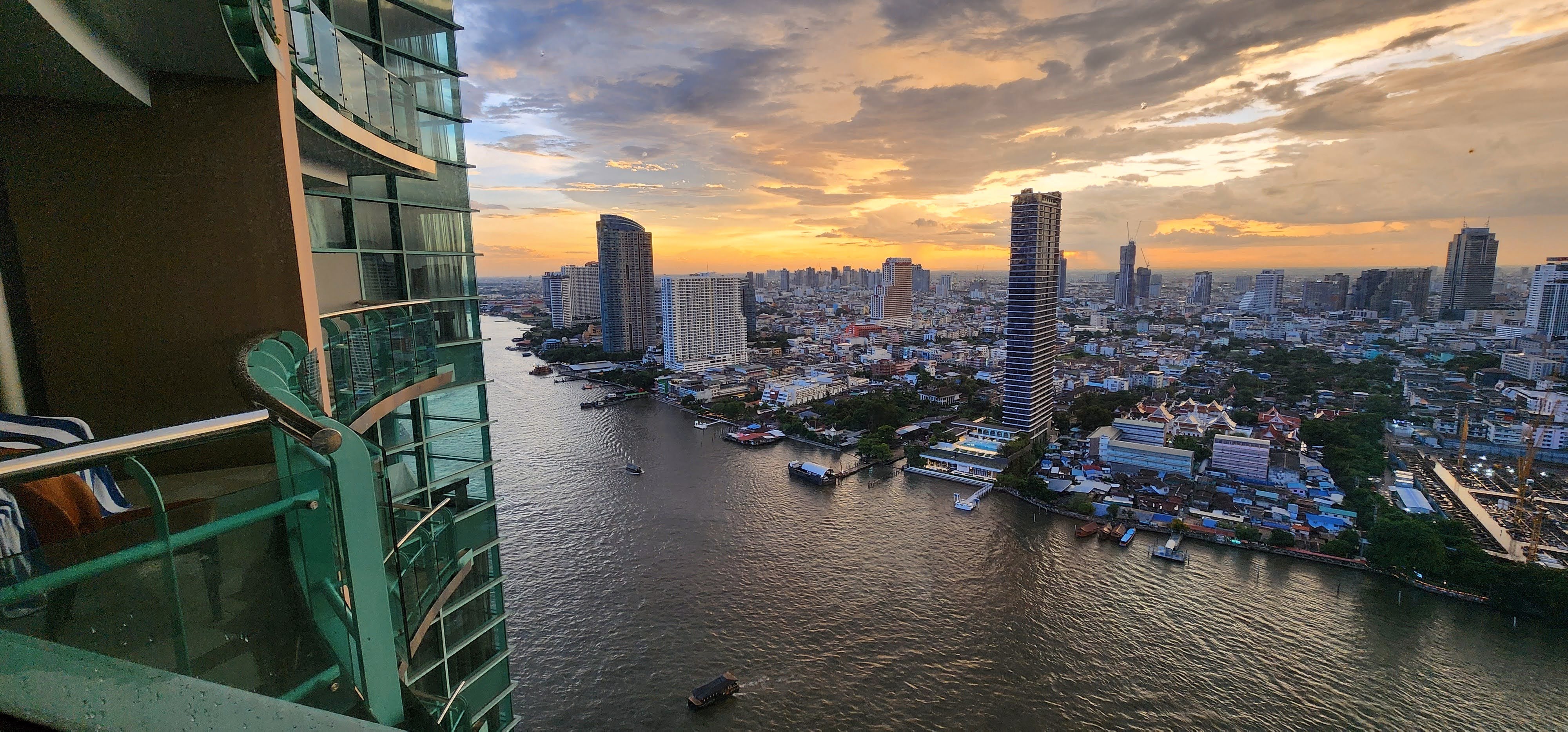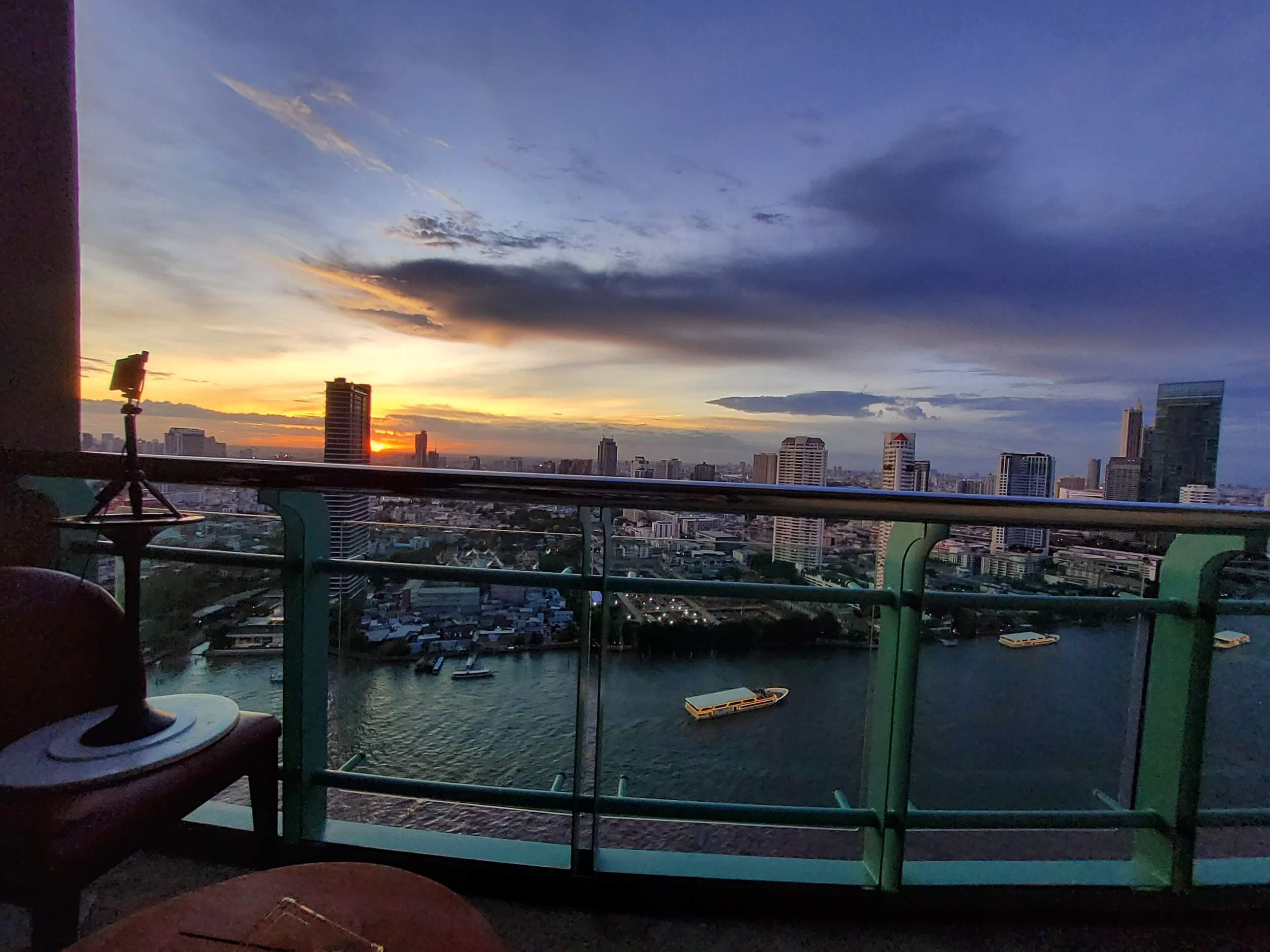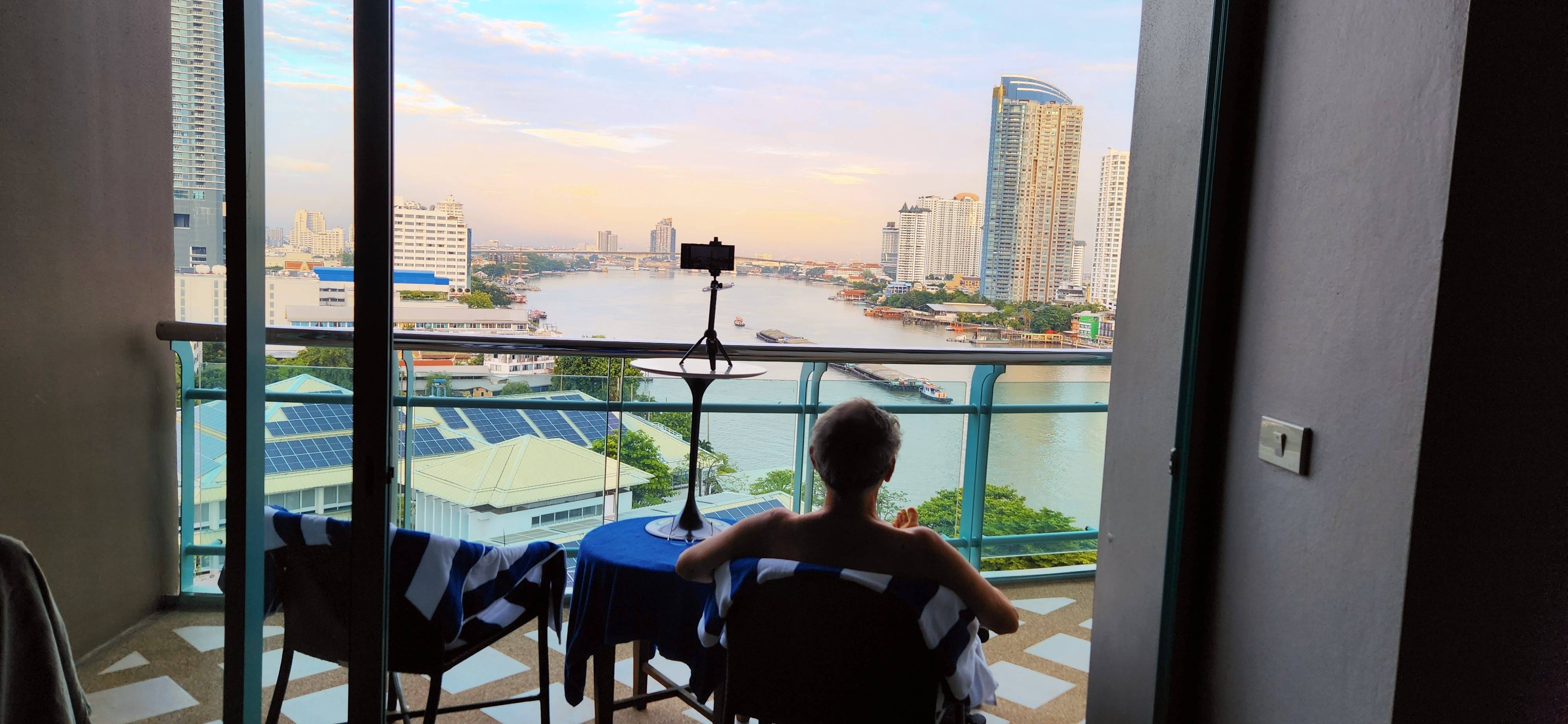 I rode the hotel ferry back from Sathorn Pier, standing there leaning over the rail as usual even though I didn’t even pretend to be taking pictures since there were no other passengers. When Nan got back from the dentist she took a short nap while I worked on photos and then we went down to happy hour canapes and a stroll along the riverfront. I’ve been capturing another sunset time-lapse while writing this. You can see how I put the little tripod on an inverted table on a chair, powered by long USB cable which also acts as a safety line just in case. I’ll post the best videos to YouTube if you’re interested.
