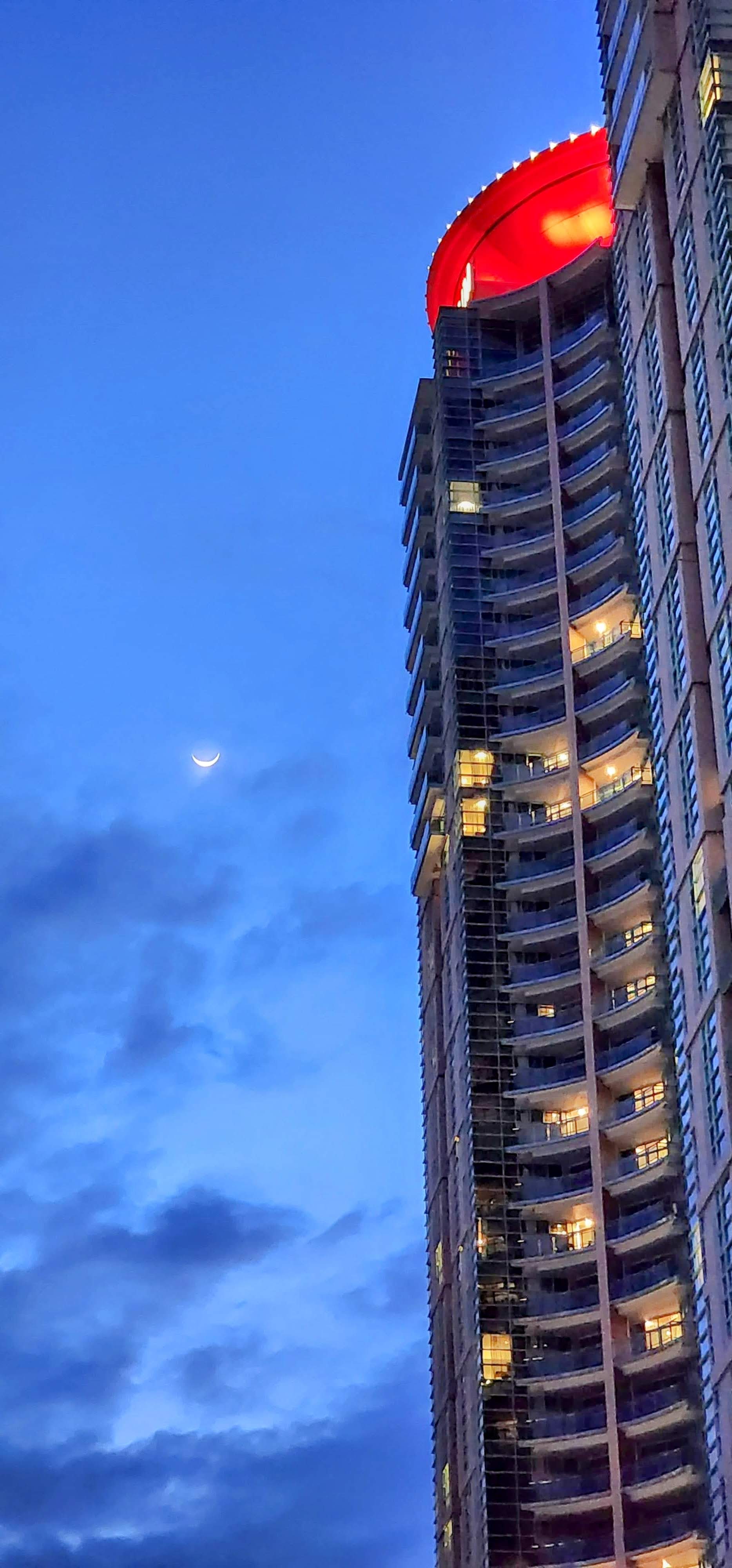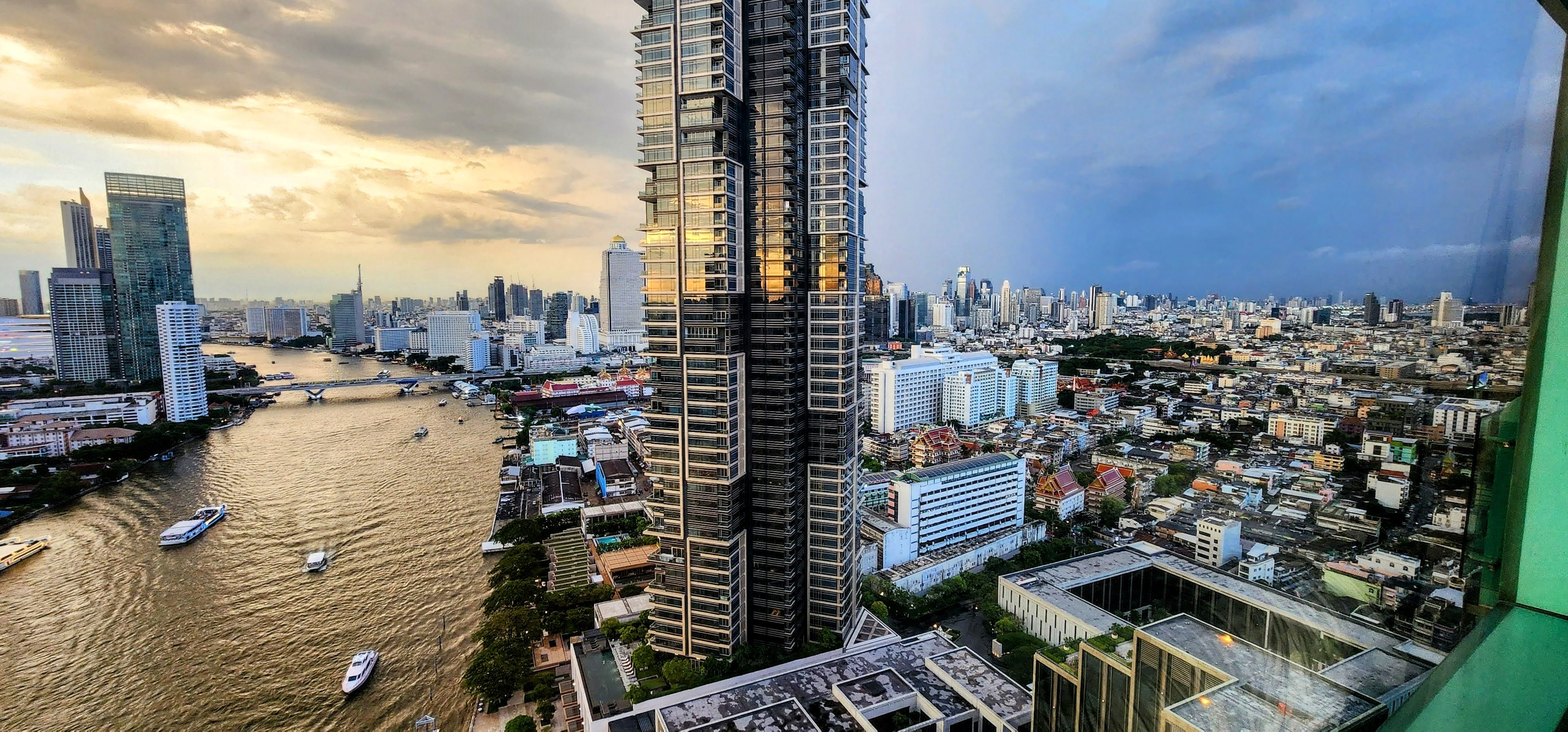 Looking northerly from the 34th floor. This is shortly after a rainy cloudburst at sunset, and some dark clouds still linger. Because of the rain there were fewer party boats than usual.