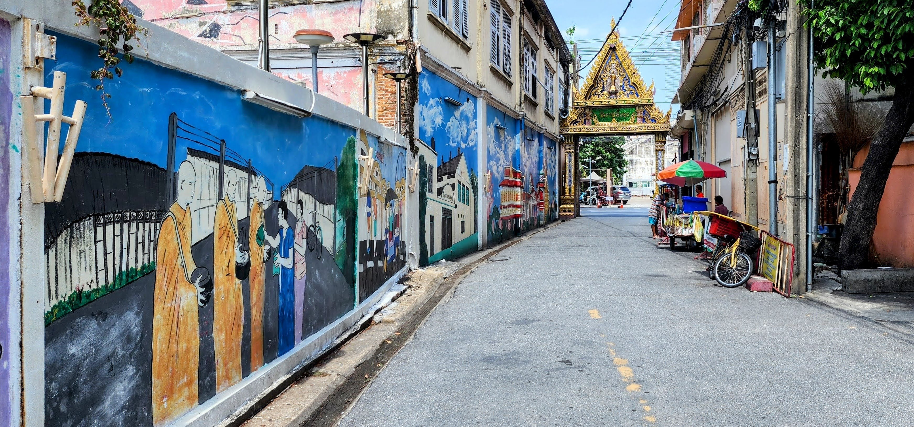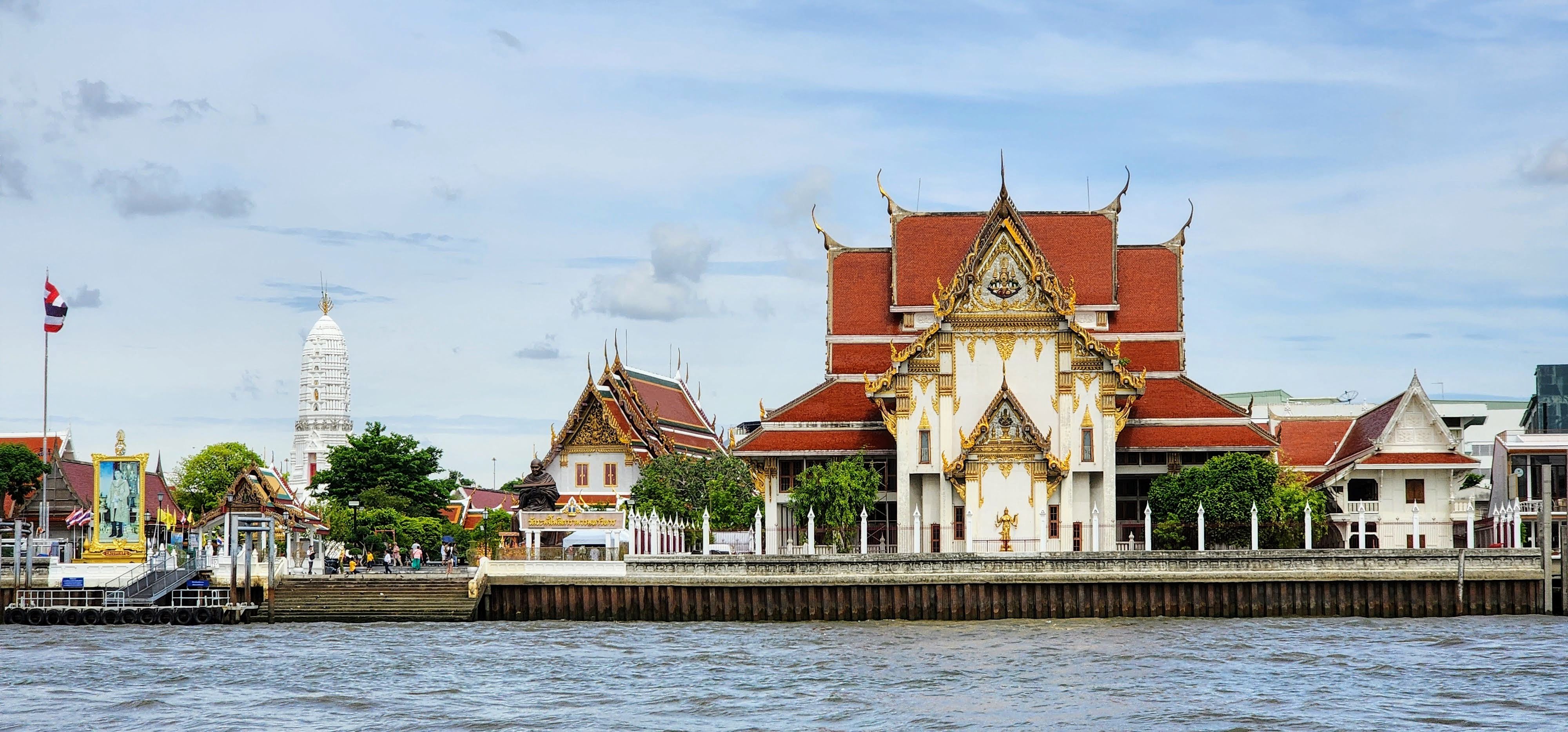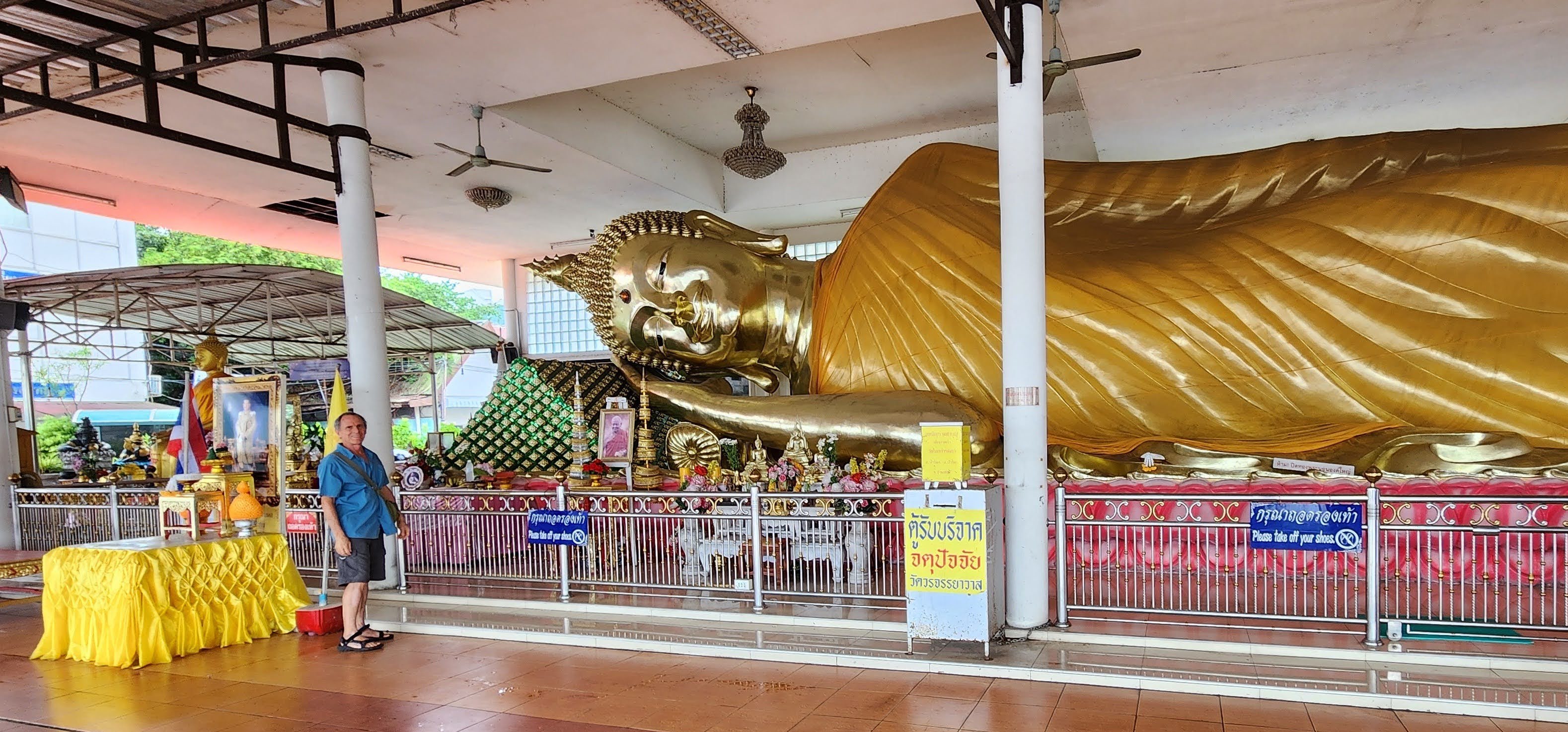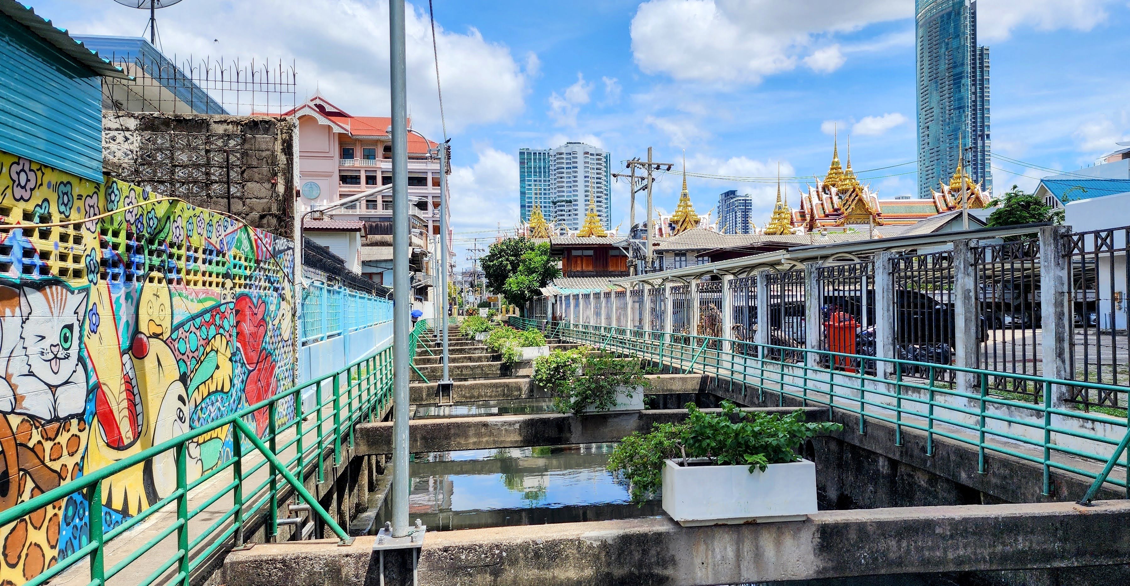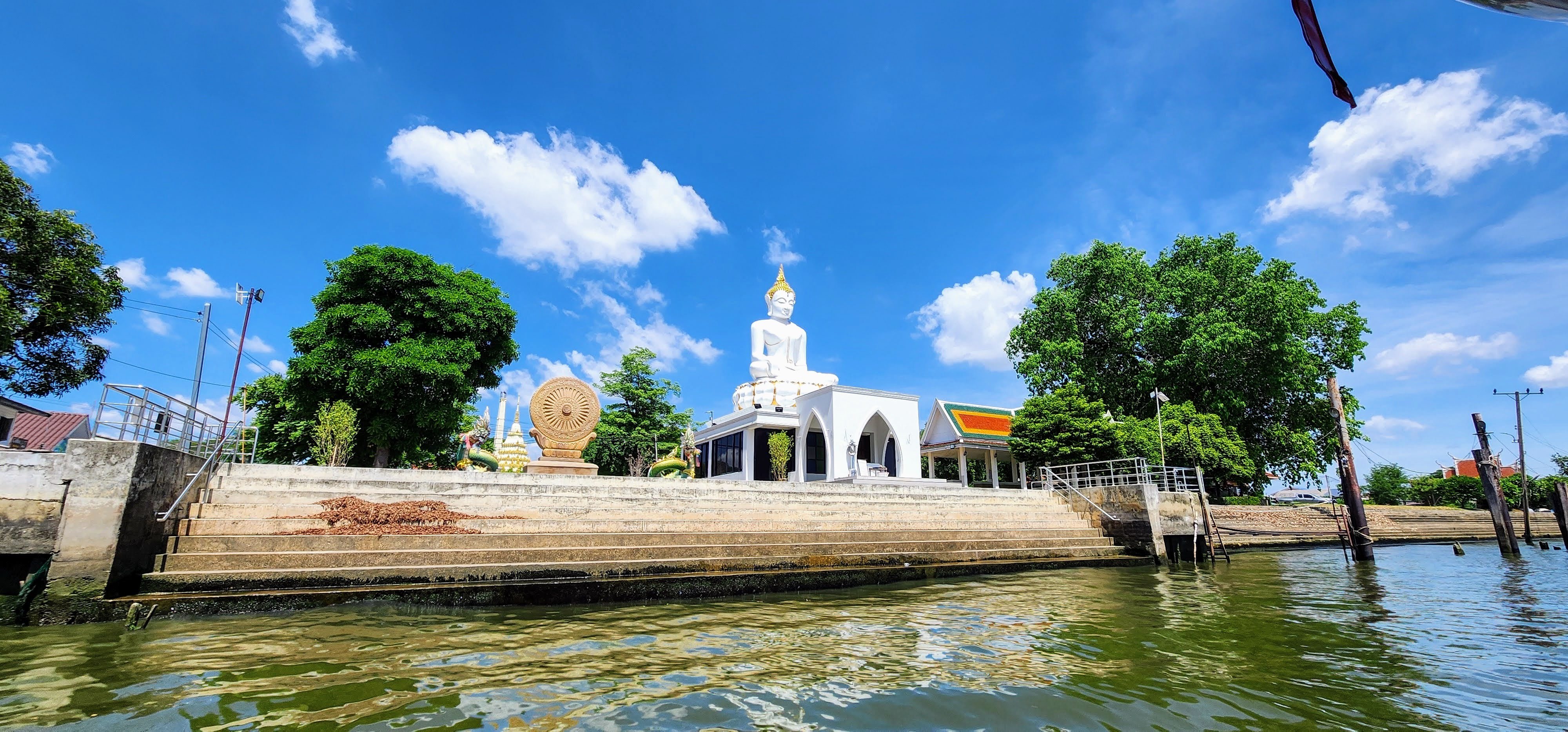 From there I followed a canal because why not? Eventually, I started seeing beautiful street art murals on walls and fences done by the neighborhood residents?? Following intuition I found some canal catwalks with more beautiful murals. I stayed on the catwalks until I finally reached Wat Yan Nawa where I and busloads of tourists enjoyed the colorful splendor. I took a few photos inside before one of the workers told me it’s not allowed. I’m glad I got the statue with the sunglasses before they stopped me (hint, he’s tall dark and on the right).