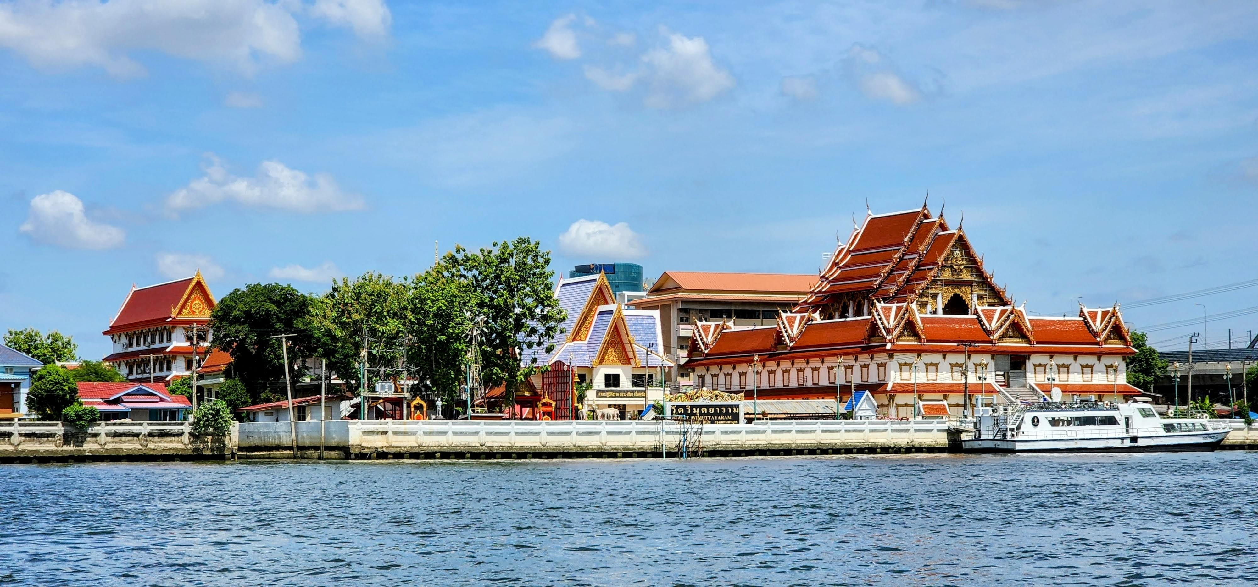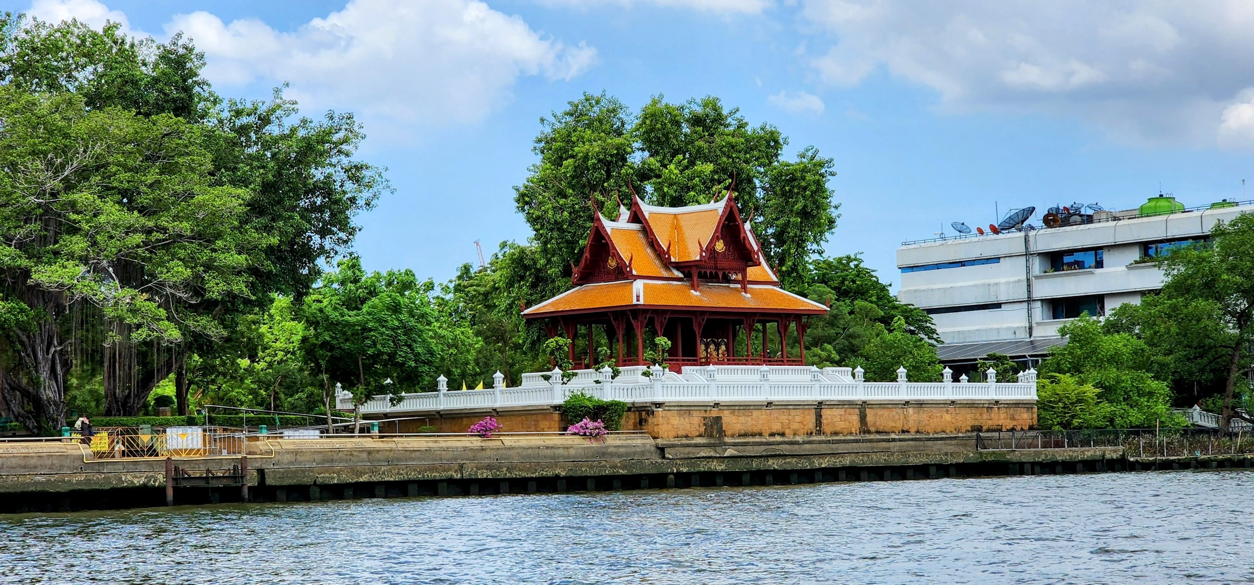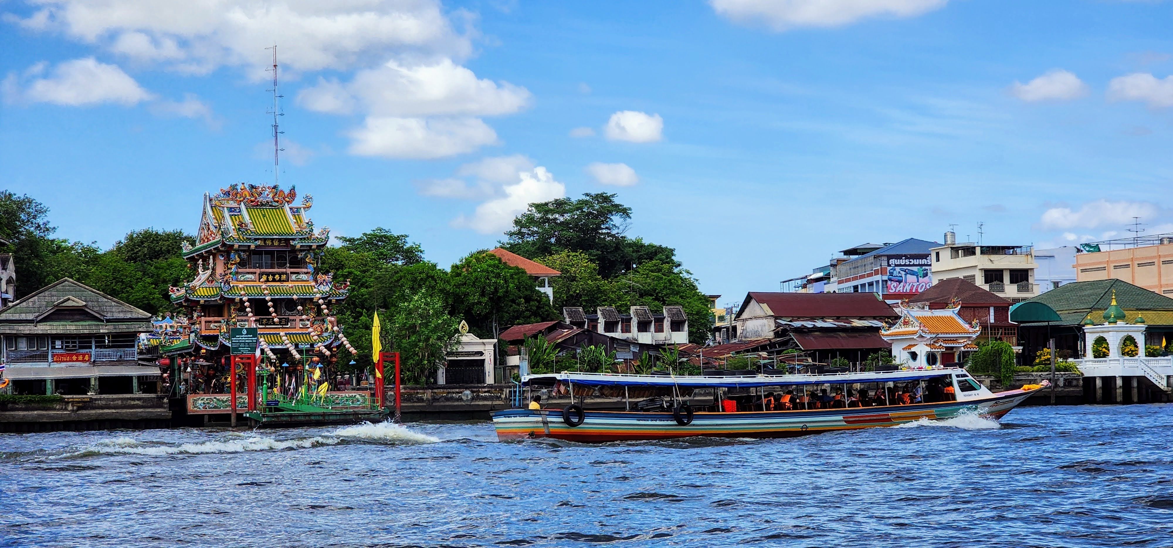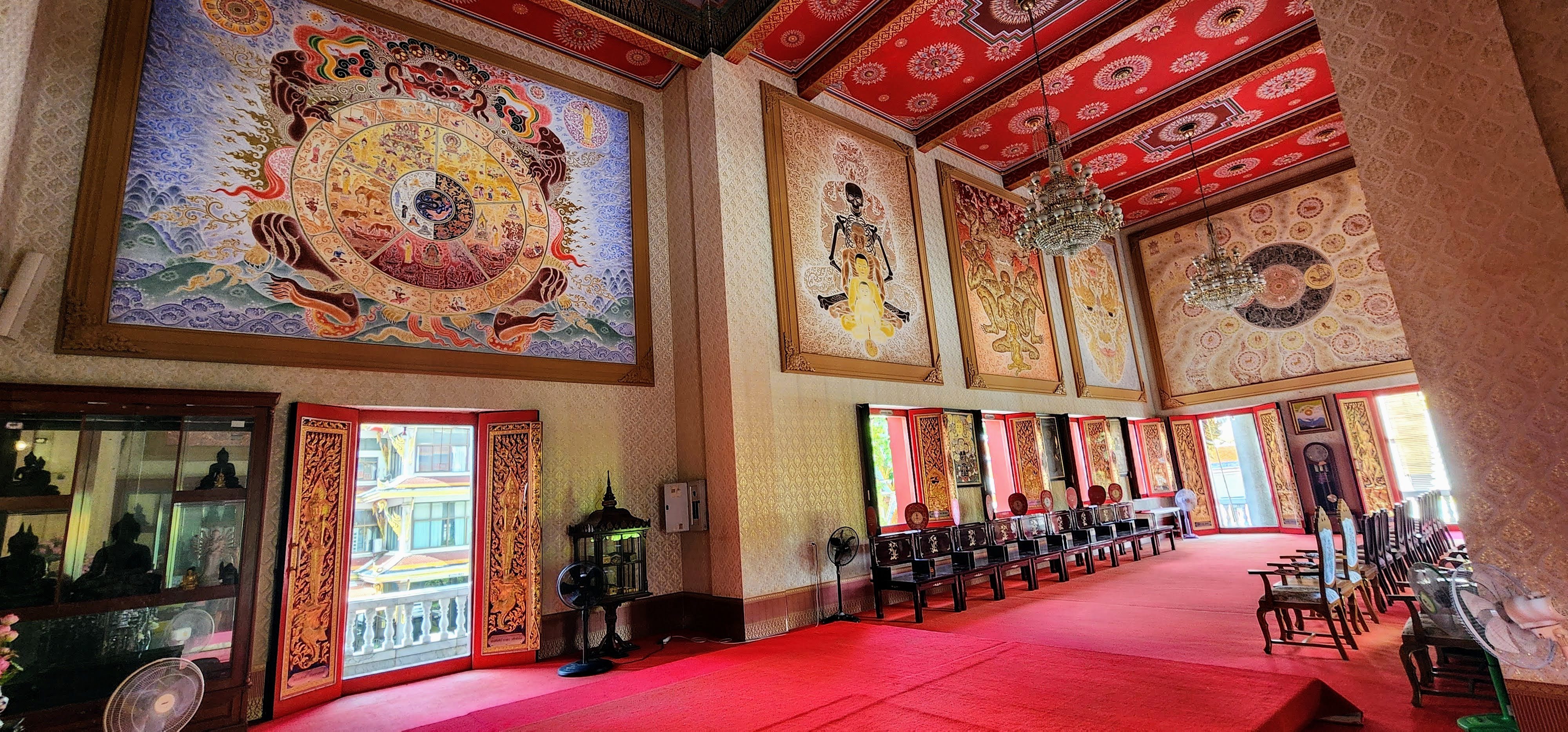From there I followed a canal because why not? Eventually, I started seeing beautiful street art murals on walls and fences done by the neighborhood residents?? Following intuition I found some canal catwalks with more beautiful murals. I stayed on the catwalks until I finally reached Wat Yan Nawa where I and busloads of tourists enjoyed the colorful splendor. I took a few photos inside before one of the workers told me it’s not allowed. I’m glad I got the statue with the sunglasses before they stopped me (hint, he’s tall dark and on the right).