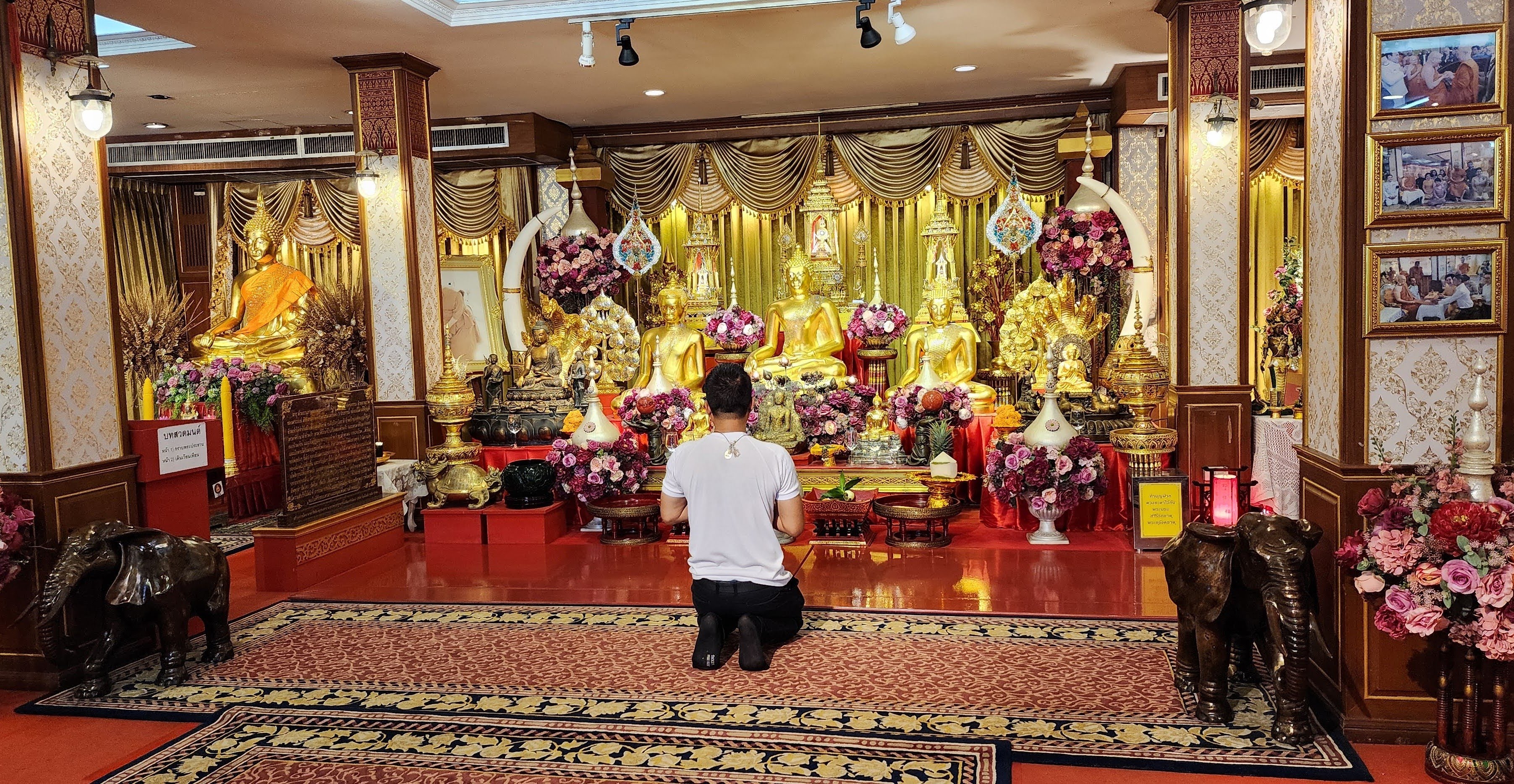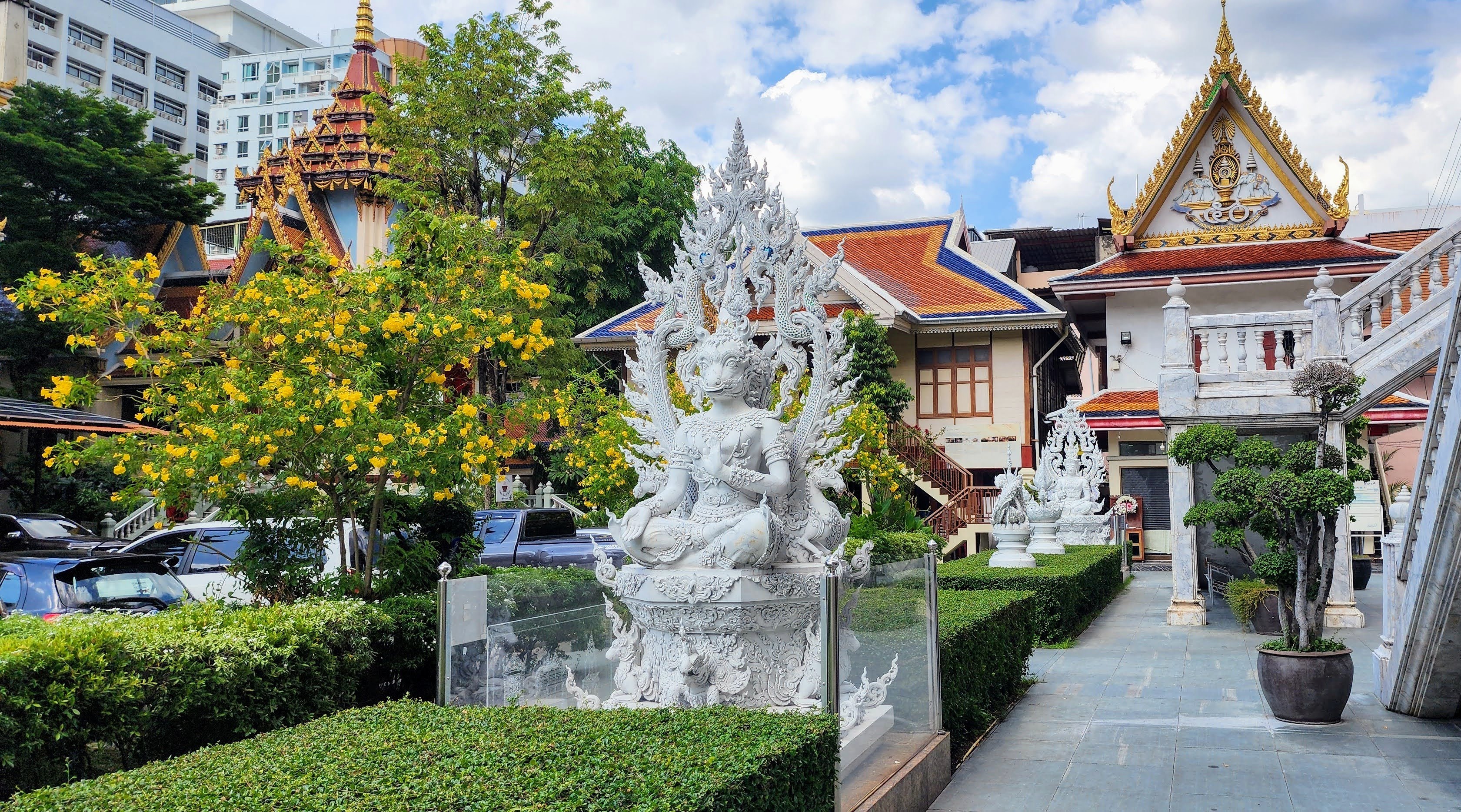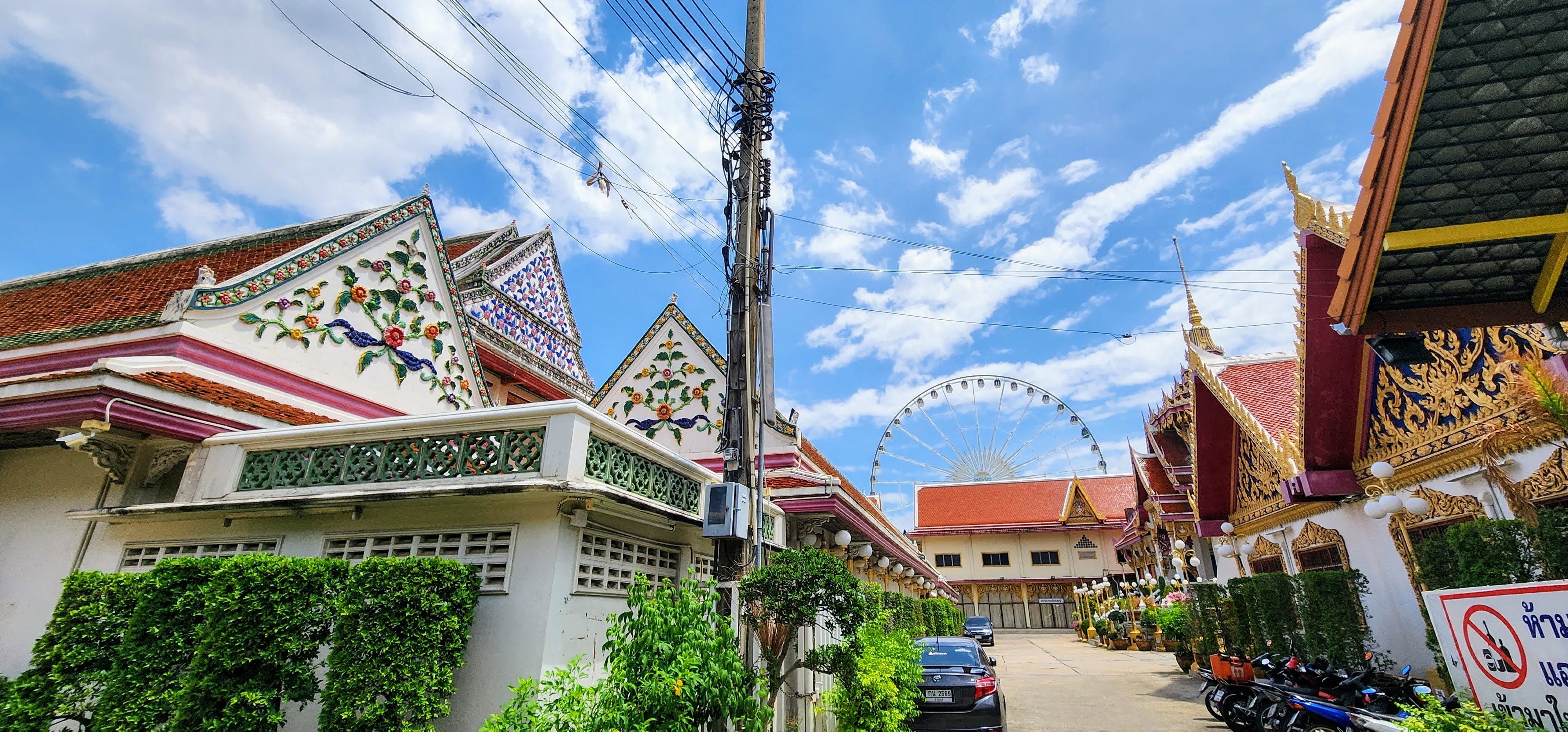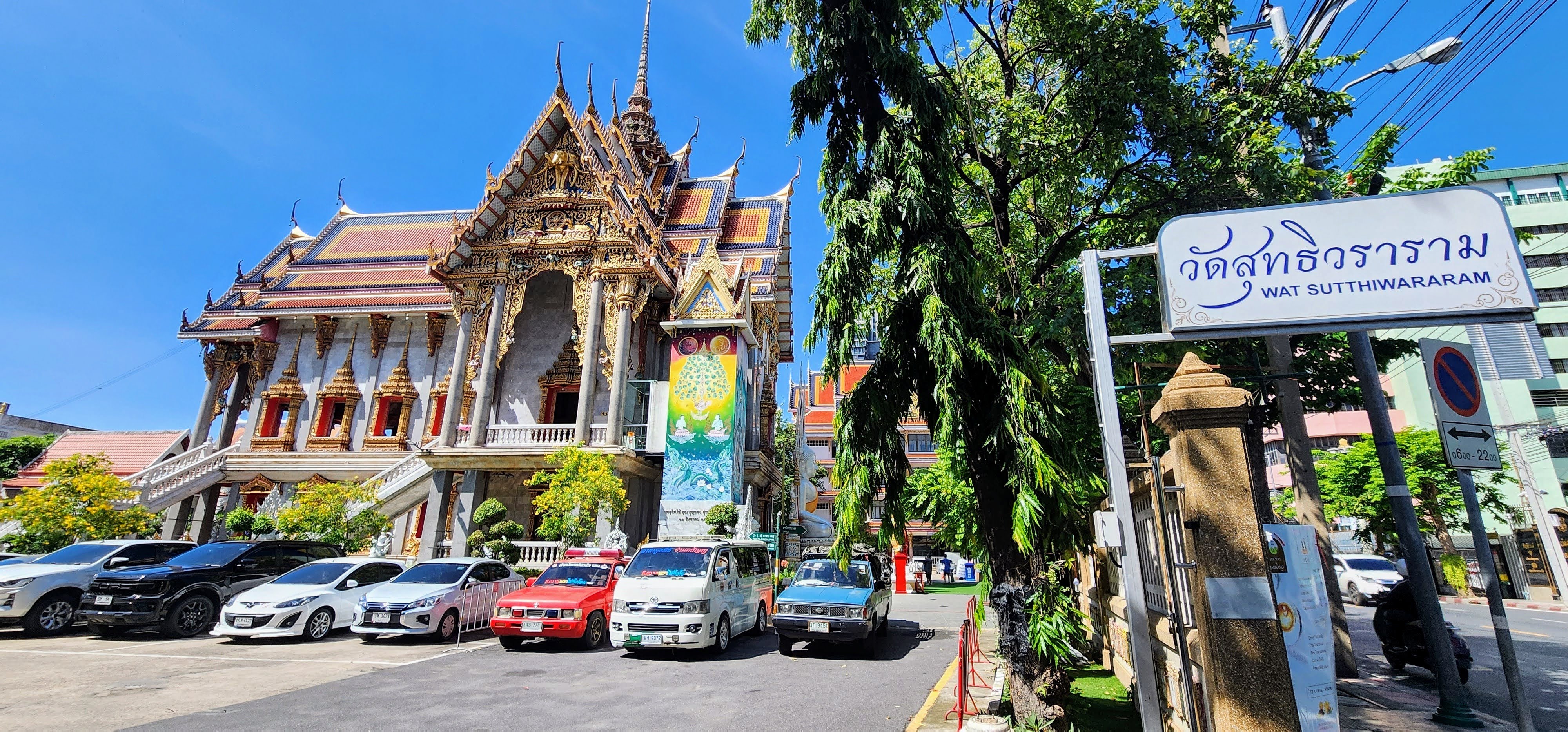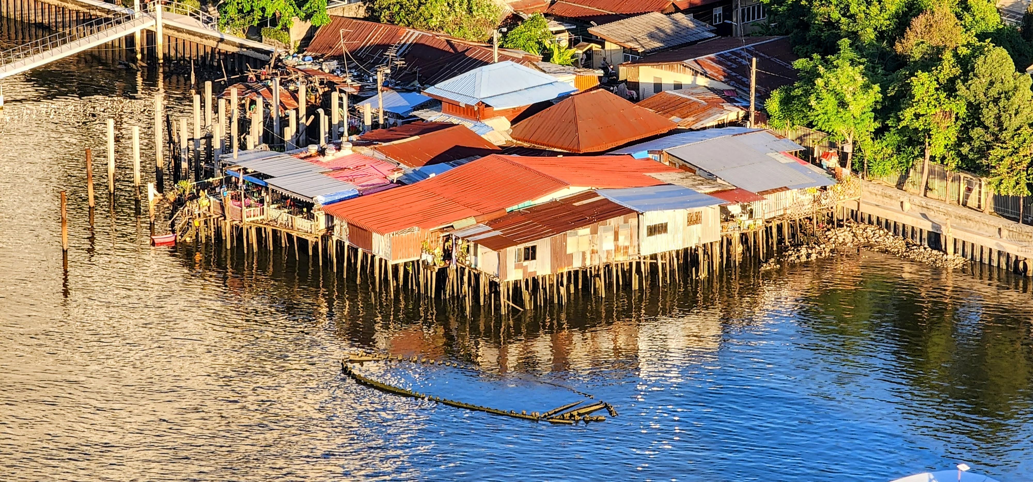 From there I followed a canal because why not? Eventually, I started seeing beautiful street art murals on walls and fences done by the neighborhood residents?? Following intuition I found some canal catwalks with more beautiful murals. I stayed on the catwalks until I finally reached Wat Yan Nawa where I and busloads of tourists enjoyed the colorful splendor. I took a few photos inside before one of the workers told me it’s not allowed. I’m glad I got the statue with the sunglasses before they stopped me (hint, he’s tall dark and on the right).