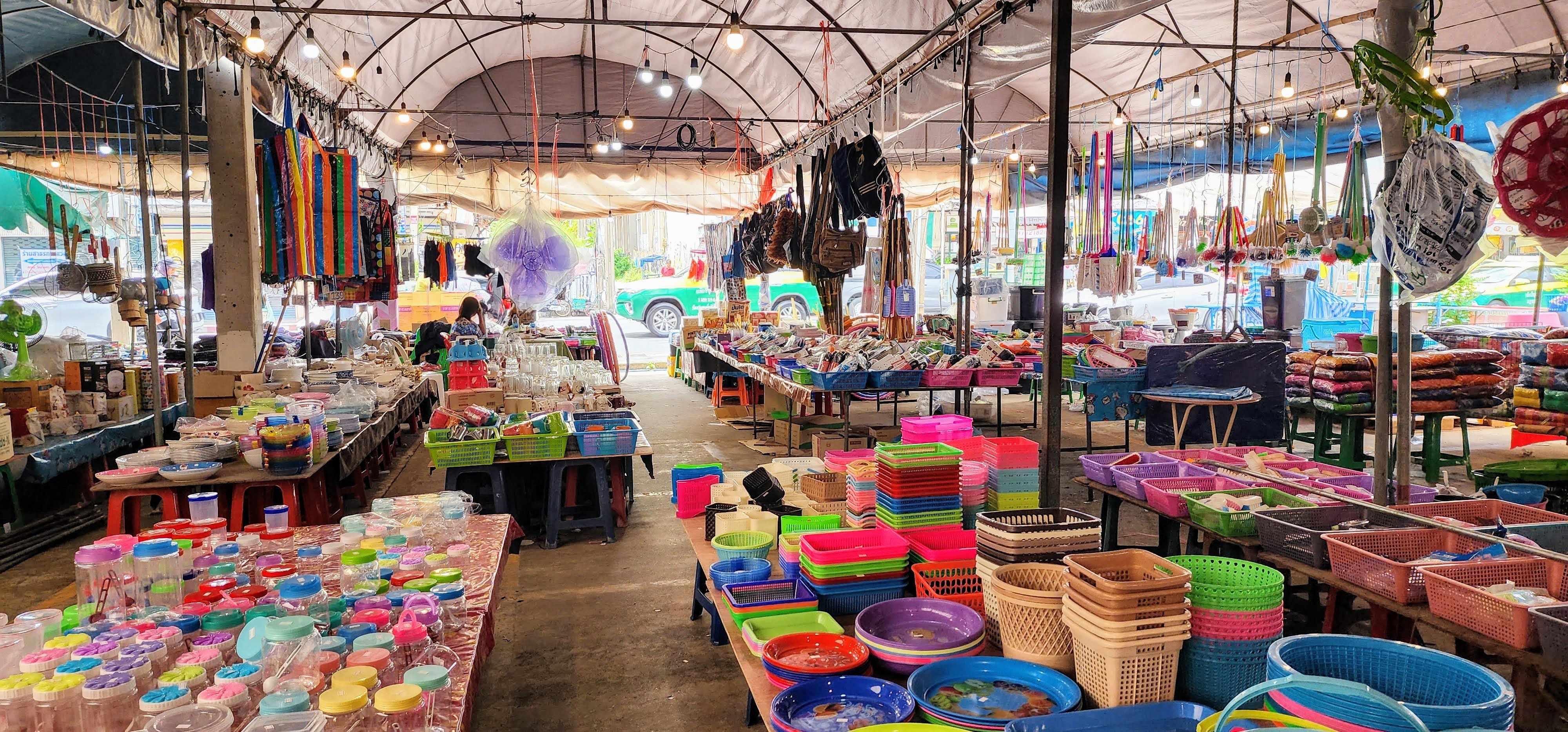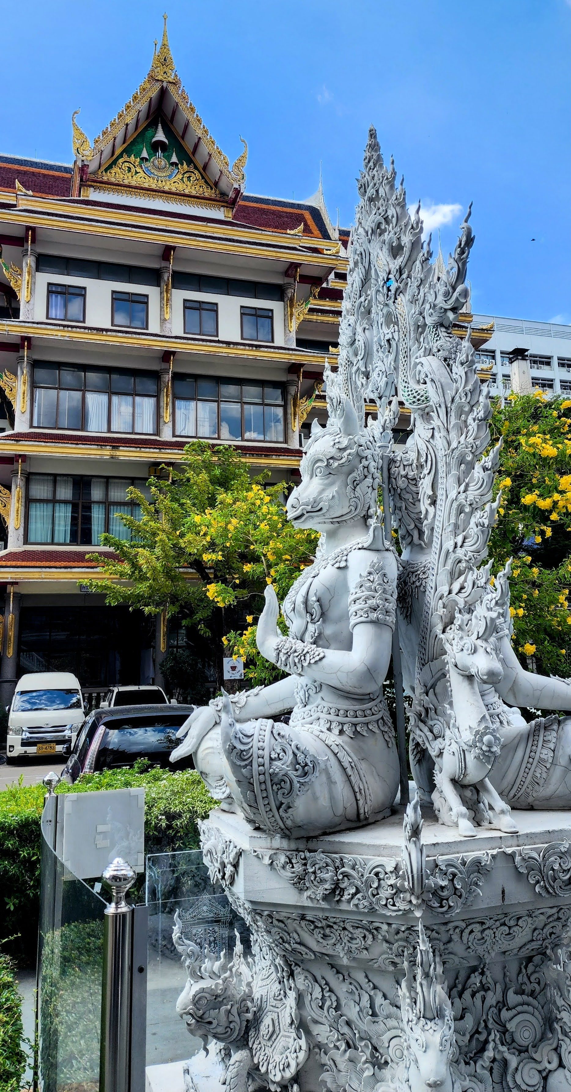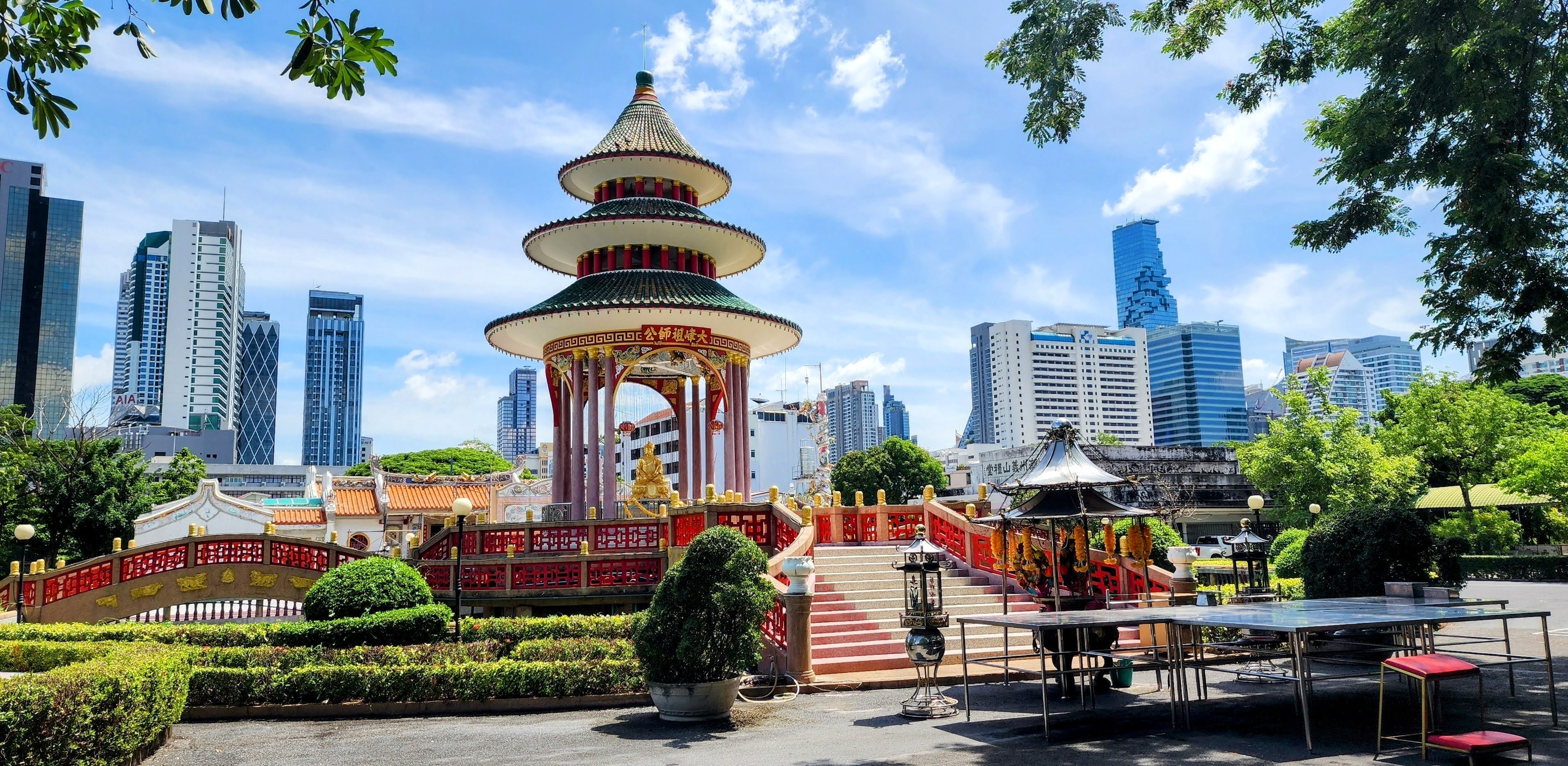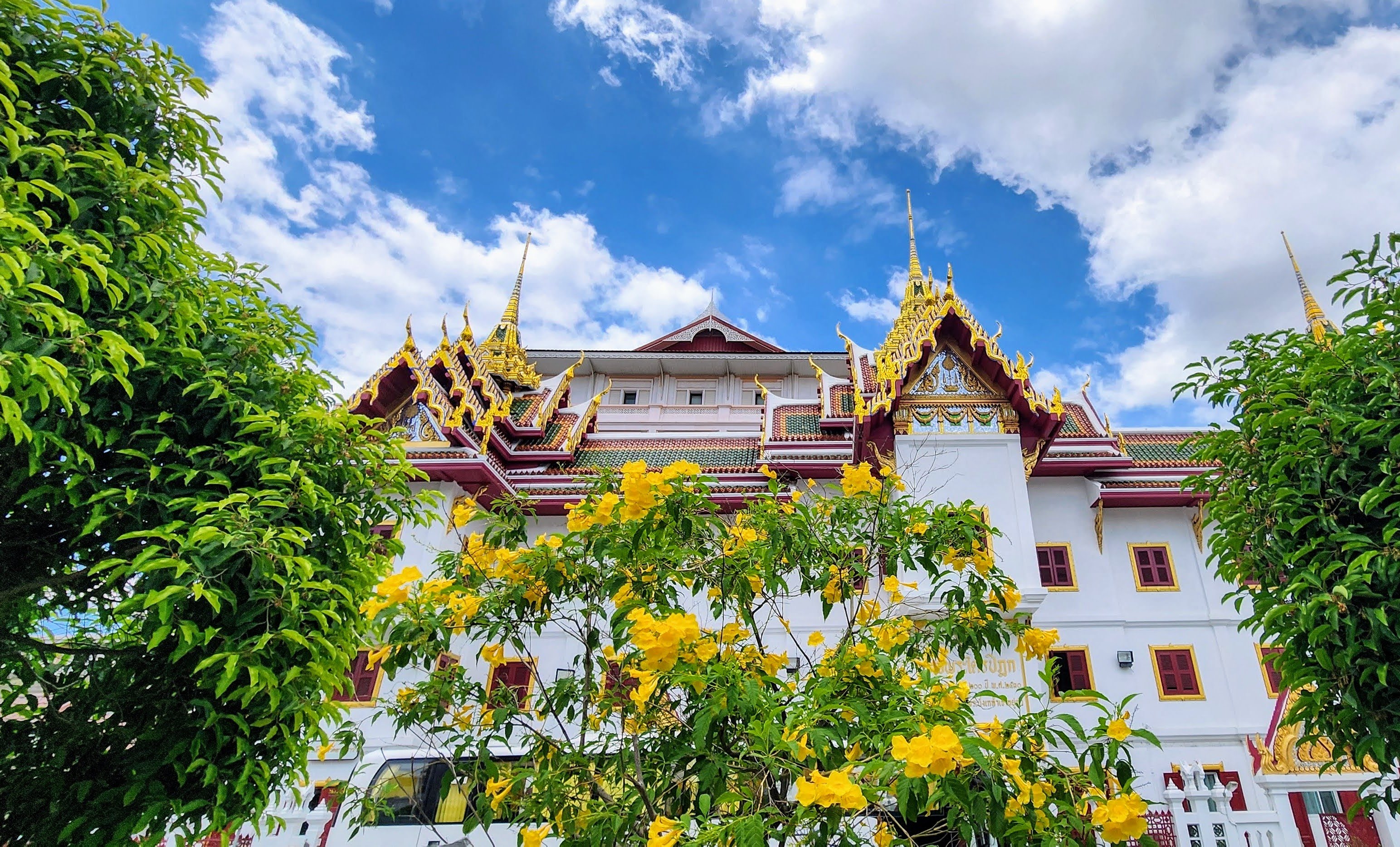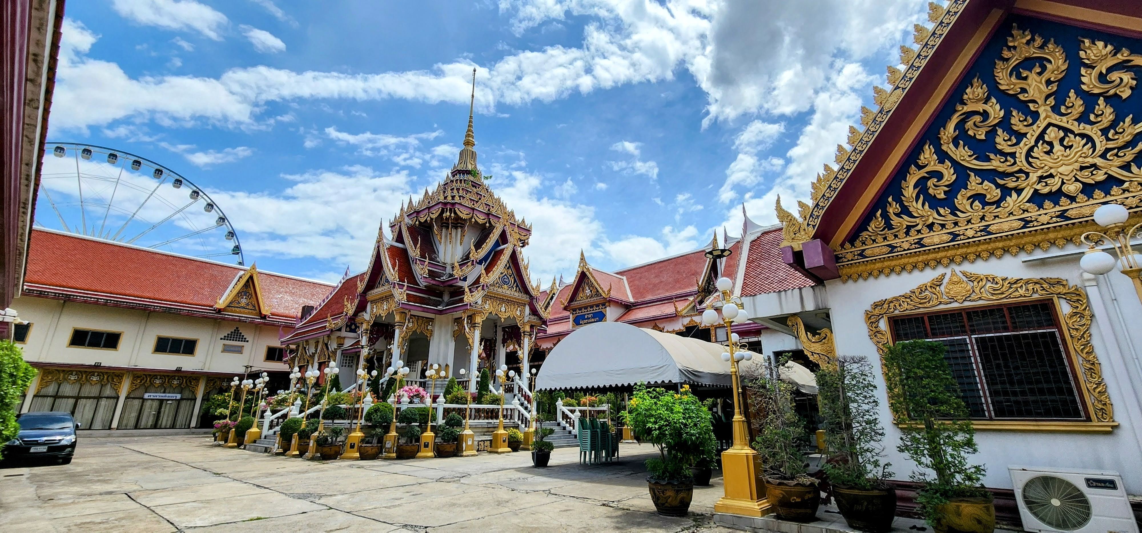 From there I followed a canal because why not? Eventually, I started seeing beautiful street art murals on walls and fences done by the neighborhood residents?? Following intuition I found some canal catwalks with more beautiful murals. I stayed on the catwalks until I finally reached Wat Yan Nawa where I and busloads of tourists enjoyed the colorful splendor. I took a few photos inside before one of the workers told me it’s not allowed. I’m glad I got the statue with the sunglasses before they stopped me (hint, he’s tall dark and on the right).