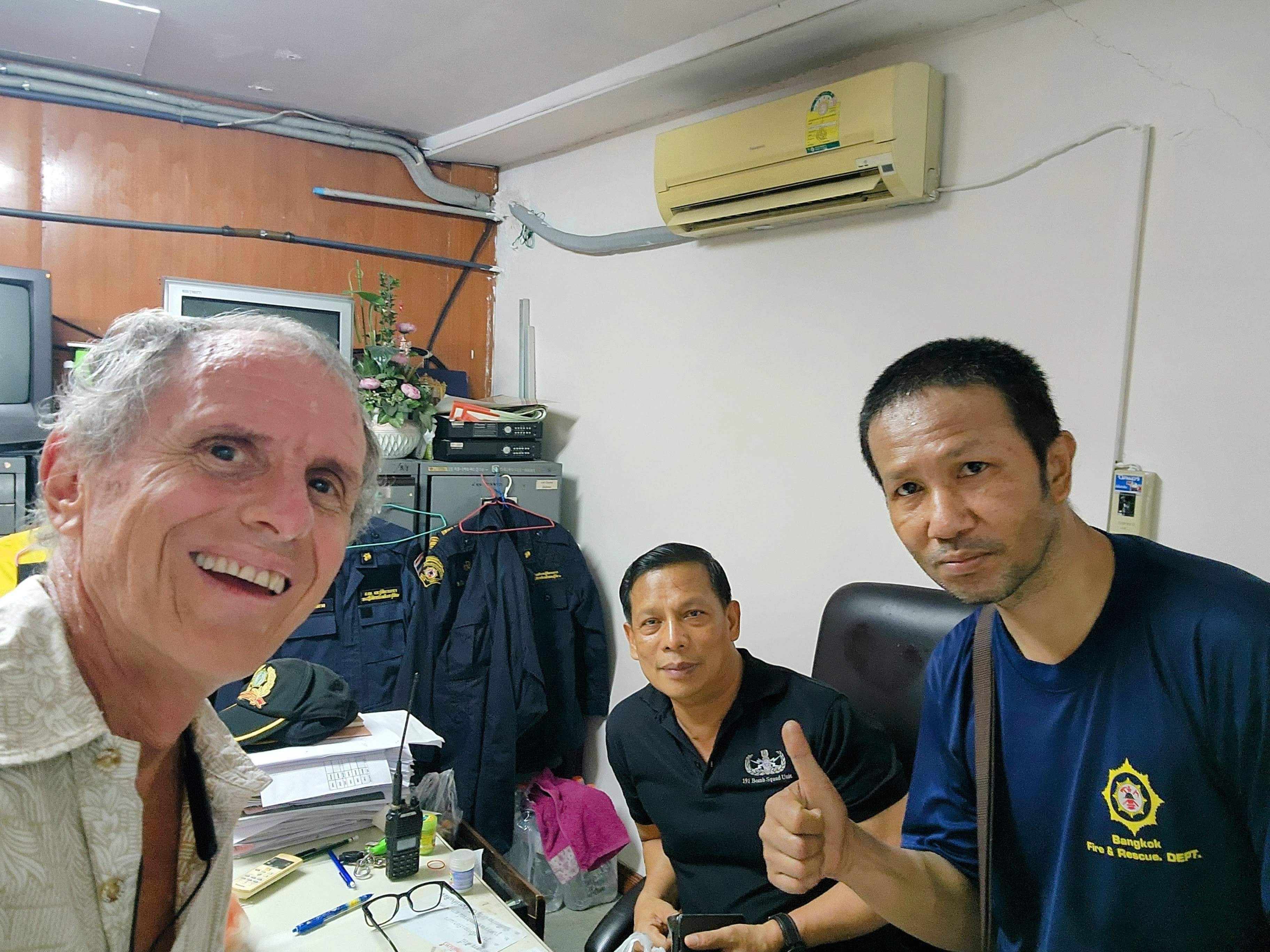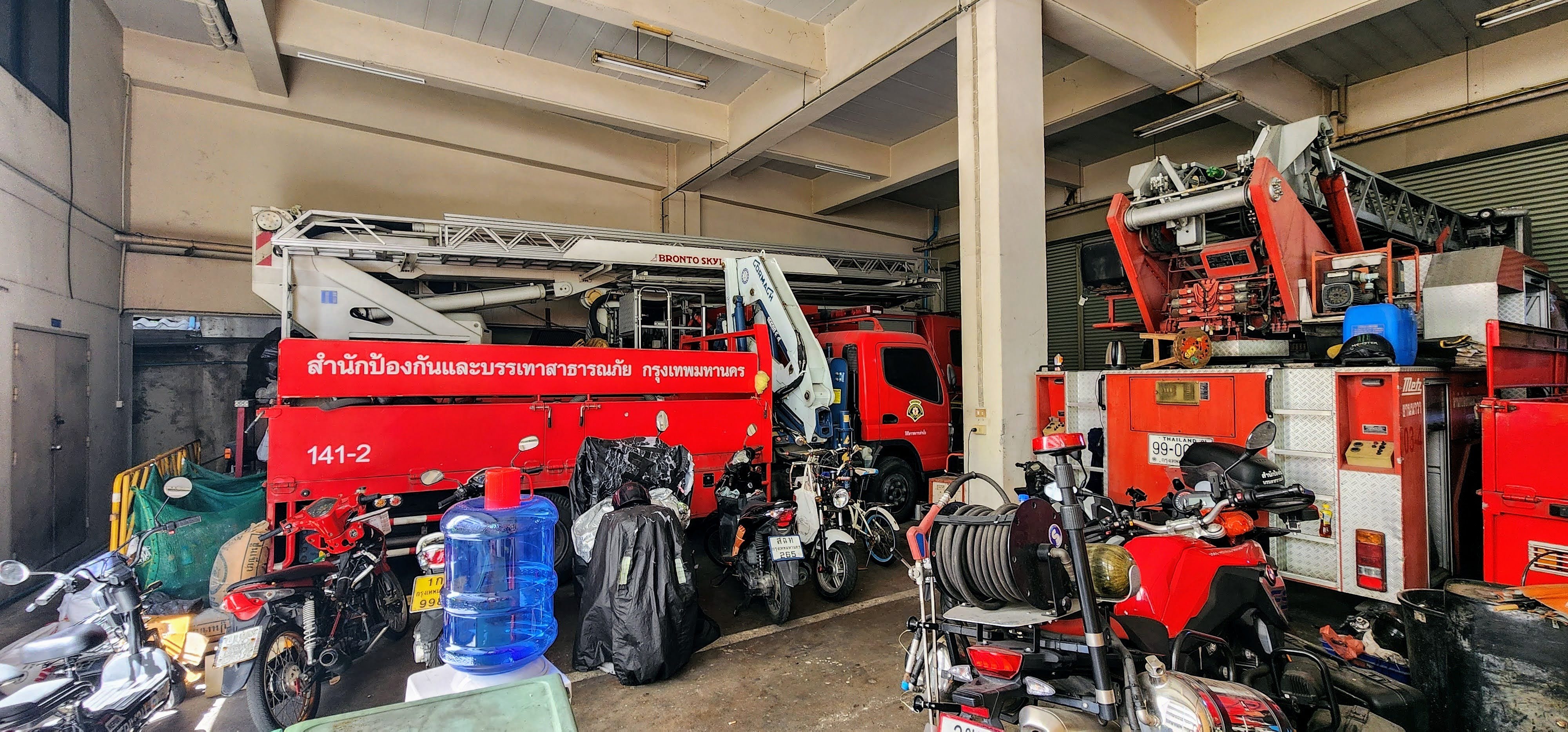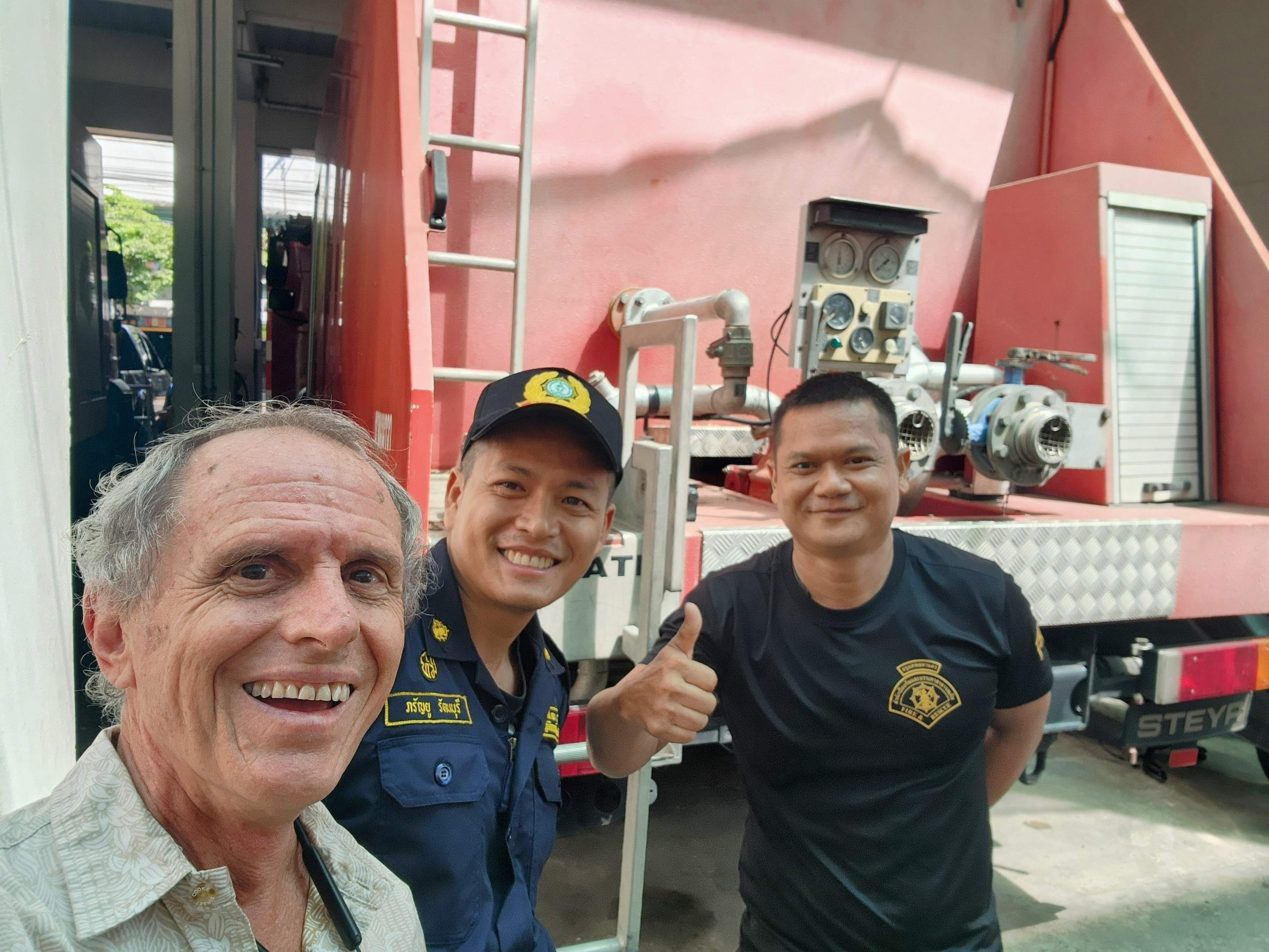 Chief Singchai is on the bomb squad (you can see it in English on the shirt he’s wearing) and in addition to fire and rescue (both people and snakes), they can also act as police. With the big hotels and high-rise condos, they have multiple ladder trucks, tankers (2,000, 5,000 and 10,000 liter), and engines they can deploy. You’ll see a bunch of scooters parked in among the big trucks so I wonder how fast their response time can be, unless maybe some firefighters use the scooters to weave through snarled traffic or side alleys to get there soonest??