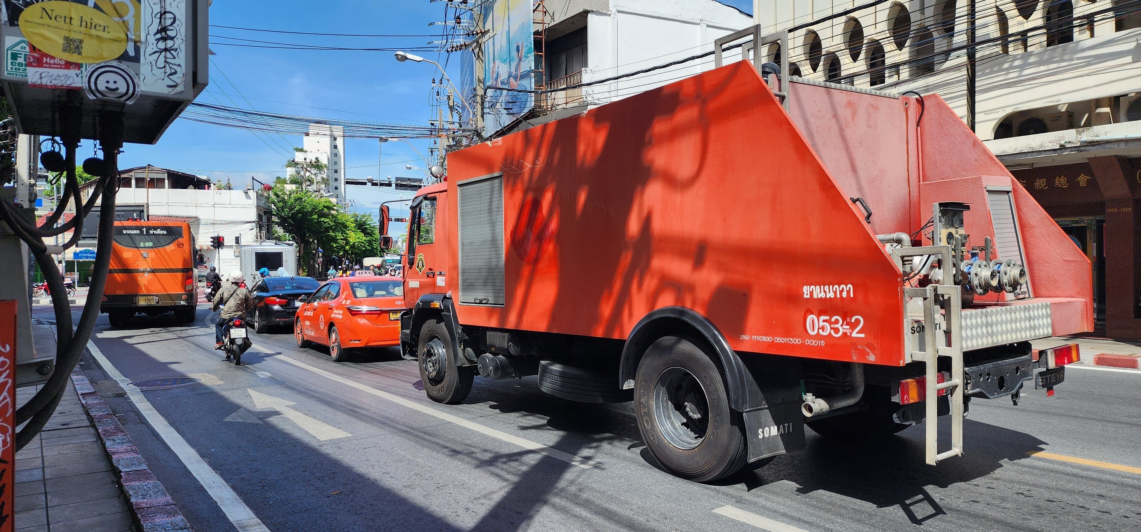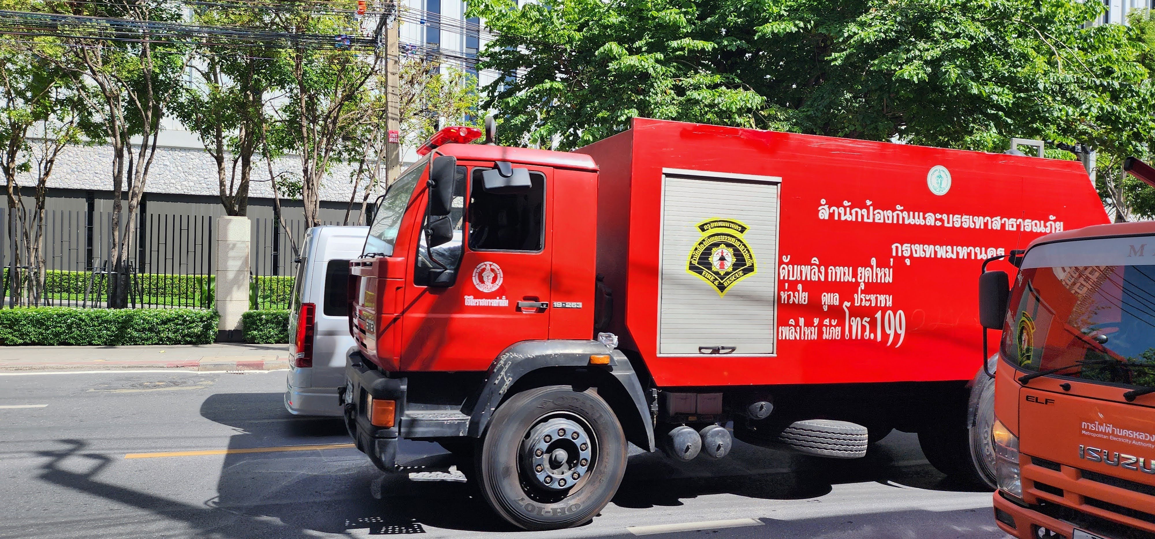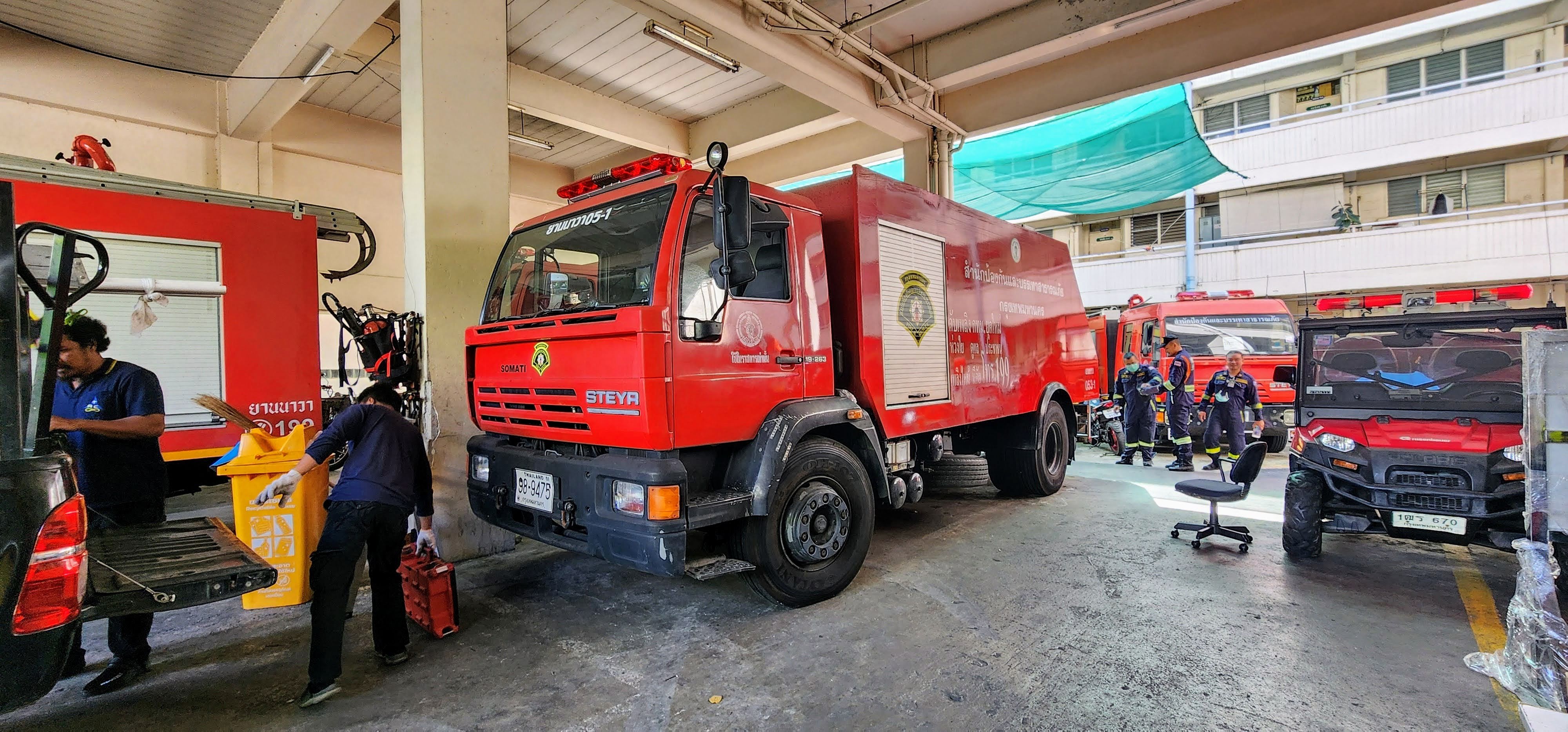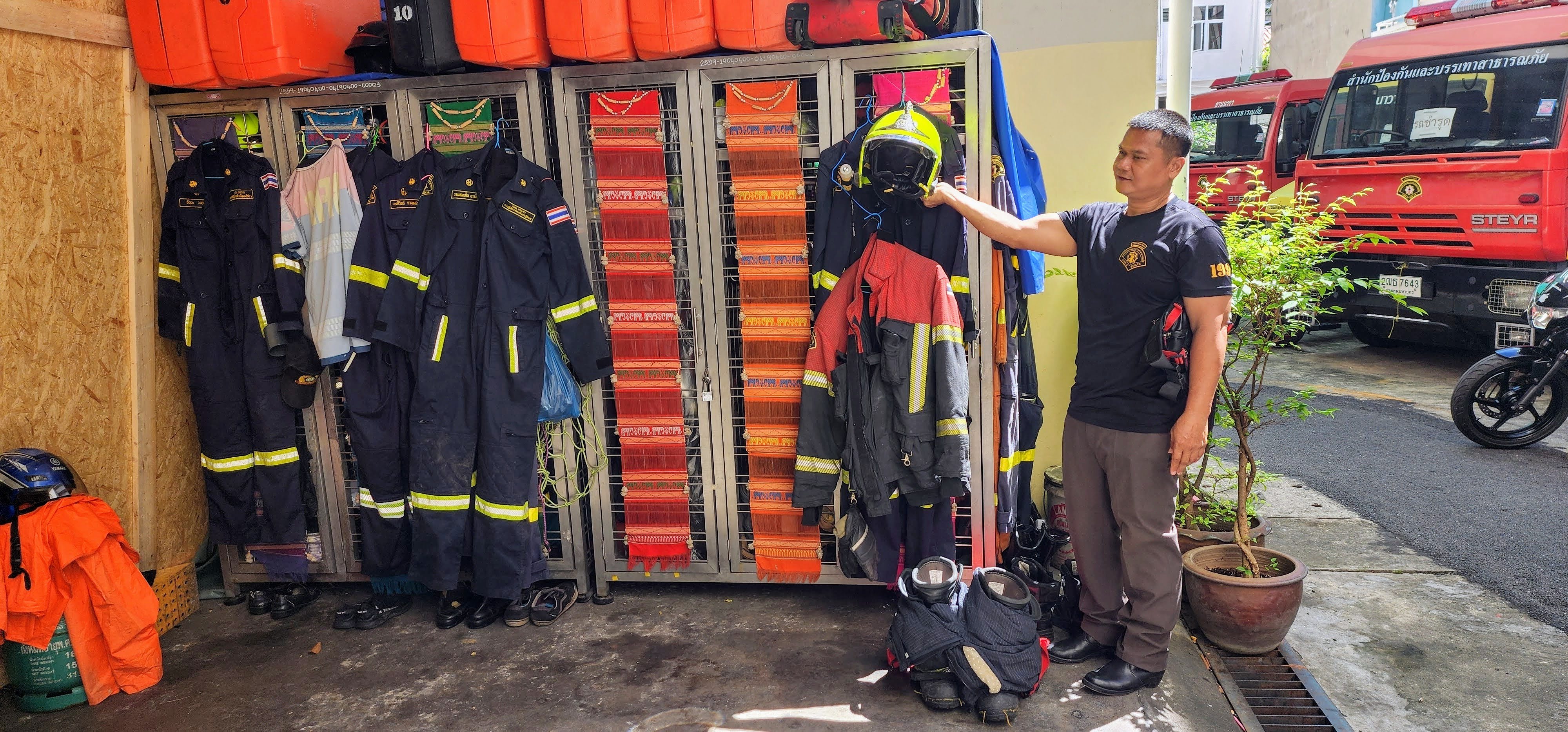 Chief Singchai is on the bomb squad (you can see it in English on the shirt he’s wearing) and in addition to fire and rescue (both people and snakes), they can also act as police. With the big hotels and high-rise condos, they have multiple ladder trucks, tankers (2,000, 5,000 and 10,000 liter), and engines they can deploy. You’ll see a bunch of scooters parked in among the big trucks so I wonder how fast their response time can be, unless maybe some firefighters use the scooters to weave through snarled traffic or side alleys to get there soonest??