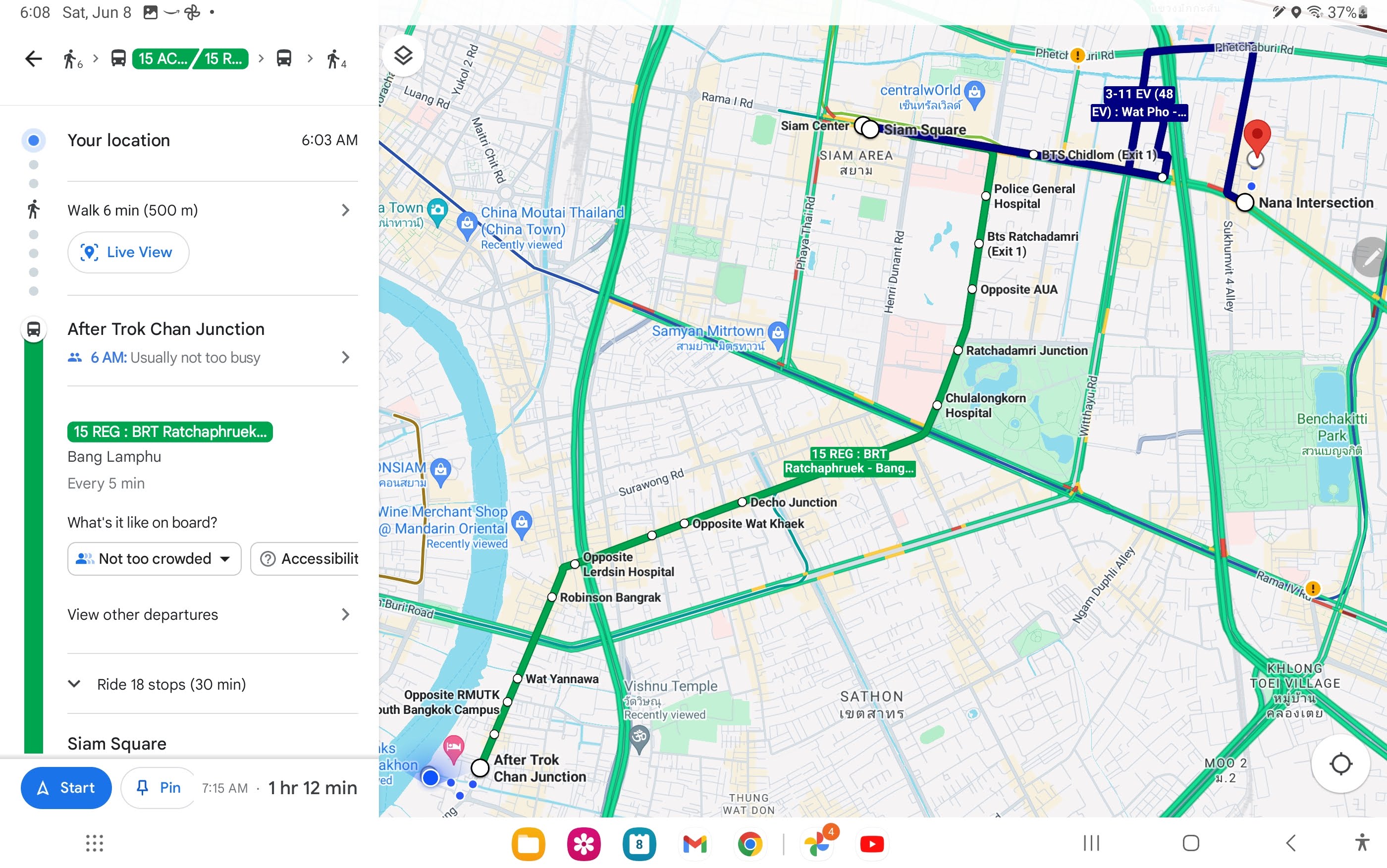Bonus excursion: Saturday morning I took the Orange Line Express Boat up to Phra Arthit Pier then walked to Khao San Road to see my old stomping grounds from 30 years ago. Apparently, it comes alive at night because at 10:30 am it was almost a ghost town aside from vendors setting up for business. Even so, I hardly recognized it with McDonalds and other Western franchise businesses now present. I remember it being seedy and full of restaurants iconic of Thai charm and low backpacker enticing prices. It seems to have gone upscale for a new breed of spring break mentality party hounds. Even with no crowds and wide spaces there were already a few aggressive hawkers who stepped in my way so I’d have to pay attention to them to avoid collision. I’ve seen basically the same thing in other countries.